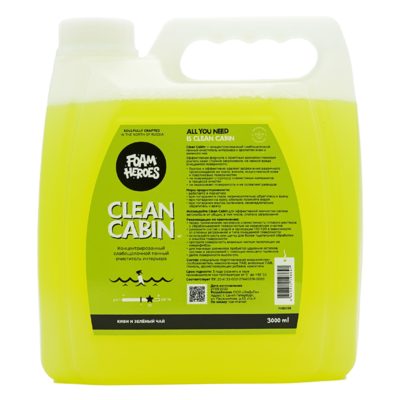 Clean Cabin от Foam Heroes — концентрированный слабощелочной состав для химчистки салона с ароматом киви и зеленого чая, объемом 3 литра Эффективная формула с приятным ароматом помогает удалить даже стойкие загрязнения, не нанося вреда очищаемой поверхности: - быстро и эффективно удаляет загрязнения различного происхождения на ткани, виниле, искусственной коже и пластиковых поверхностях - не повреждает структуру совместимых материалов в процессе очистки - не окрашивает поверхность и не оставляет разводов Используйте Clean Cabin для эффективной химчистки салона автомобиля от общих, в том числе, стойких загрязнений Рекомендации по применению: - перед применением проверьте совместимость готового раствора с обрабатываемой поверхностью на незаметном участке - разведите состав с водой в пропорции 1:10-1:20 в зависимости от степени загрязнения и типа очищаемой поверхности - используйте кисть или щетку для более тщательной обработки и очистки поверхности - протрите поверхность влажным чисты