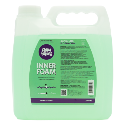 Inner Foam от Foam Heroes — pH-нейтральный пенный состав для химчистки салона с легким ароматом озоновой свежести, объемом 3 литра Специальная формула состава с приятным ароматом помогает удалить даже стойкие загрязнения с самых деликатных поверхностей интерьера автомобиля: - бережно удаляет загрязнения различного происхождения с поверхностей из ткани, винила, пластика, дерева, кожи, замши и алькантары - не повреждает структуру материалов в процессе очистки, дополнительно смягчая ее - не окрашивает поверхность и не оставляет разводов Используйте Inner Foam для эффективной бережной очистки деликатных элементов интерьера, таких как текстиль, винил, пластик, дерево, кожа, замша и алькантара Рекомендации по применению: - перед применением проверьте совместимость готового раствора с обрабатываемой поверхностью на незаметном участке - разведите состав с водой в пропорции 1:10-1:20 в зависимости от степени загрязнения и типа очищаемой поверхности - используйте кисть или щетку для более тщател