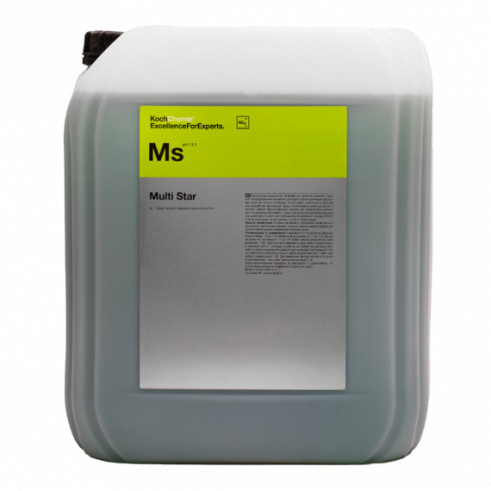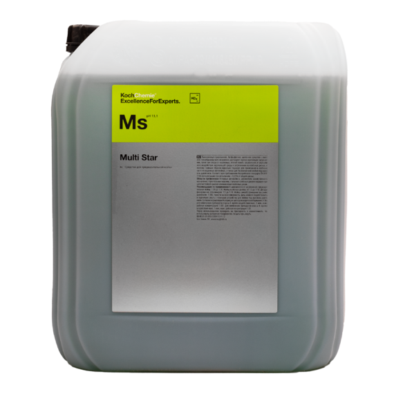 Состав для первичной мойки (pH 13). Без фосфата. Сильнопенящийся, без запаха. За счёт использования химических составляющих последнего поколения и нейтрализующих присадок, Multi Star не влияет на ЛКП, хром, алюминий и резину. Имеет очень высокую концентрацию. Области применения: легковые автомобили, автомобили хозяйственного назначения, грузовой транспорт, стальные колёсные диски и окрашенные щелочестойкой краской алюминиевые колёсные диски. Разведение с водой: Пенокомплект: 1:3–1:5, расход (1 а/м): 80–150 мл; Пеногенератор: 1:30–1:50, расход (1 а/м): 80–150 мл; Дозатор: 2–4%, расход (1 а/м): 40–60 мл. Рекомендации по применению: Нанести на всю поверхность, через 2 минуты тщательно смыть с помощью устройства для мойки под высоким давлением. Предупреждения! Не использовать на горячих поверхностях! Не доводить до высыхания!