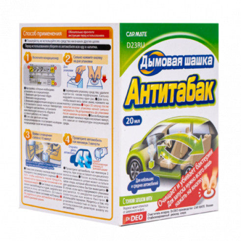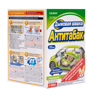 Cigarette Deodorant Steam устраняет неприятный запах табака и уничтожает микробов в системе кондиционирования и в салоне автомобиля. Формула с ионами серебра позволяет устранить запахи, накопившиеся в сидениях автомобиля. Дымовая шашка не маскирует запахи, а устраняет причины их появления - бактерии, вирусы, грибки, скопившиеся в системе кондиционирования автомобиля. Бактерицидный эффект достигается благодаря использованию стабилизированного диоксида хлора.