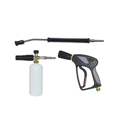 Универсальный пенный комплект используется для быстрой бесконтактной мойки автомобилей. Пенный комплект обеспечивает дозированное нанесение активной пены на поверхность автомобиля и быструю смену насадок для смывания водой. Пенная таблетка встроенная в сопло насадки обеспечивает качественную, стойкую пену для более длительного воздействия на грязь. Байонетный затвор позволяет быстро снимать и устанавливать как копьё высокого давления, так и бачок с моющим средством. Пенная насадка сделана с применением латунных комплектующих, что обеспечивает высокую прочность конструкции. Комплектация: Копьё с соплом; Насадка с бачком для моющего средства, с регулировками концентрации моющего раствора и плотности пены; Пистолет высокого давления с курком и предохранителем от случайного нажатия.