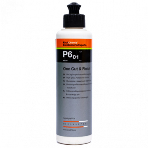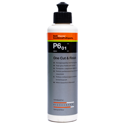 Полировальная паста One Cut&Finish P6.01 предназначена для быстрого придания поверхности зеркального блеска, эффективного удаления царапин и следов мелкозернистой полировки (с гритностью P2000). Наличие в составе полировальной пасты воска карнаубы обеспечивает защиту поверхности. Максимальный результат с минимальными затратами времени и сил. Плотность: 1,07 (1000 мл – 1070 грамм) Степень шлифования: 6 Степень блеска: 8 Рекомендации по применению: Нанести небольшое количество пасты One Cut & Finish P6.01 на оранжевый полировальный круг One Cut; Равномерно распределить по поверхности ЛКП; С помощью эксцентриковой полировальной машинки отполировать поверхность; Скорость вращения и усилие - средние; Располировать остатки микрофиброй.