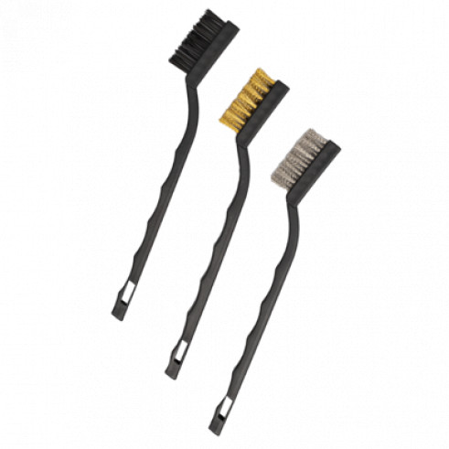 Набор из 3-х мини-щеток предназначен для следующих задач во время химчистки, а также очистки экстерьера: Чёрная щётка с жёсткой силиконовой щетиной подходит для очистки стыков на тканевых сидениях и других труднодоступных мест в интерьере, а также для очистки узких проёмов и решёток на кузове автомобиля; Золотистая щётка средней жёсткости из медного сплава подходит для очистки велюра, замшевых поверхностей или нубука; Щетка с серебристой жёсткой щетиной из нержавеющей стали применяется для удаления ржавчины с металла